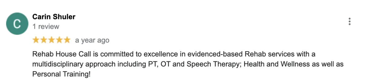 Disclaimer: Procedures and treatments performed by Rehab House Call have an inherent success (and failure) rate. Reviews, testimonials and content on this site should not be interpreted as a statement of efficacy of procedures and treatments performed by Rehab House Call for anyone else.